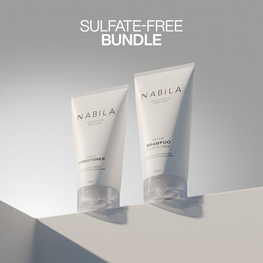 Introducing the NABILA Sulfate-Free Repair Bundle, featuring the Repair Sulfate-Free Shampoo and Repair Conditioner—the ultimate duo for color-treated, curly, or sensitive hair. This gentle yet powerful formula cleanses without stripping the hair of its natural oils, hydrates without weighing them down, and helps maintain vibrant, healthy hair.
